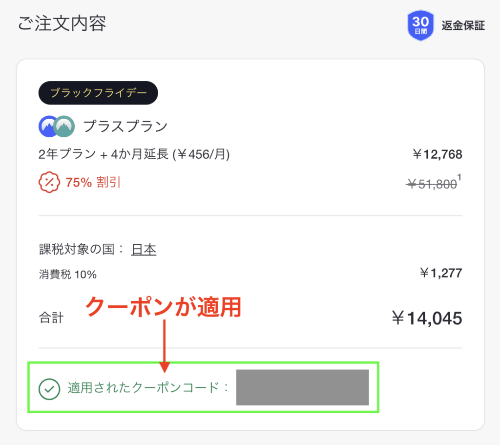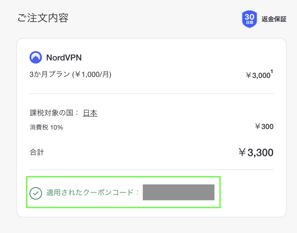 適用されたクーポンコードがNordVPNの購入画面で適用されるので、コードが表示されているかを確認して、購入を進めてください。